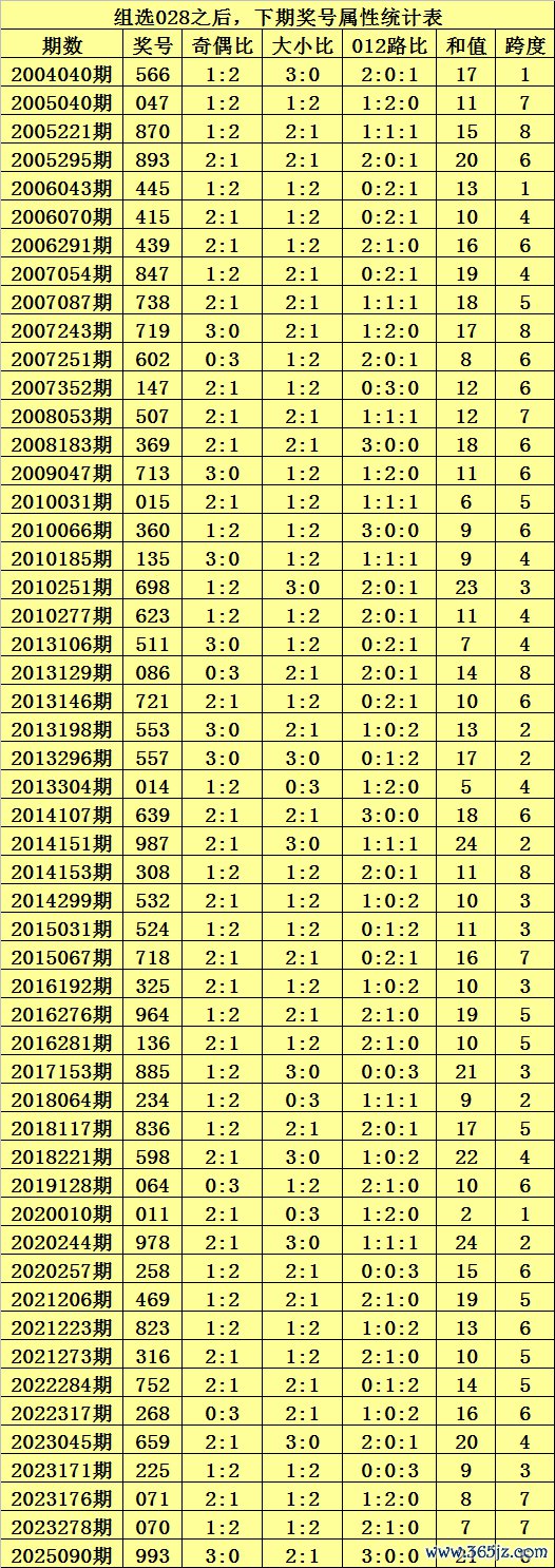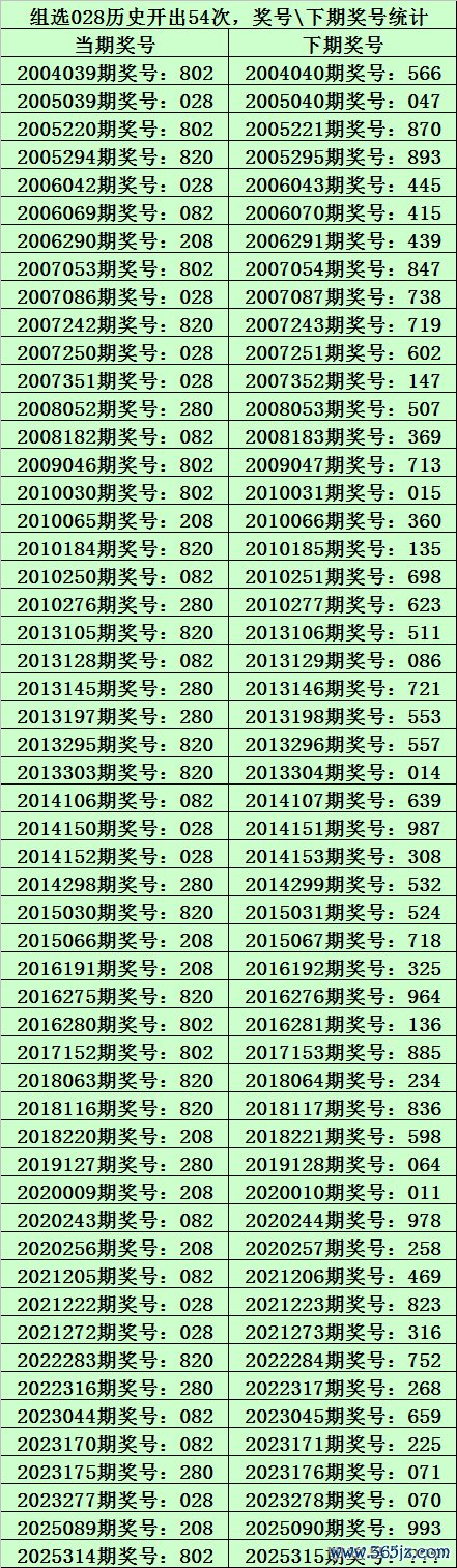 二、组选028分析:摆列三历史上已开出54次组选号码028了,其奖号和下期开出奖号统计如下: